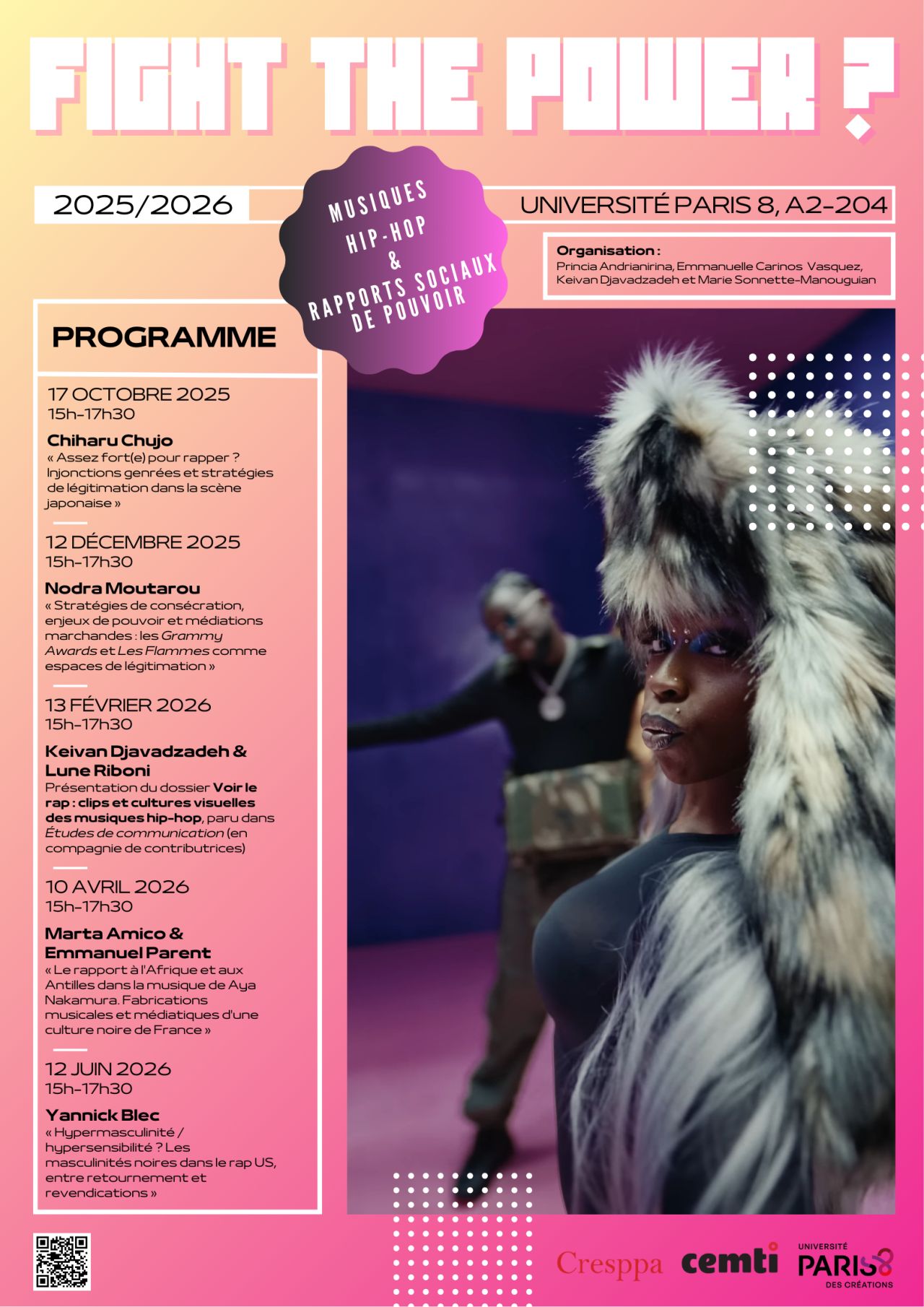 Le séminaire "Fight the power ? Musiques hip hop et rapports sociaux de pouvoir" (CRESPPA / Cemti) reprend cette année à l’Université Paris 8, en salle A2-204, les vendredi après-midi de 15h à 17h30.